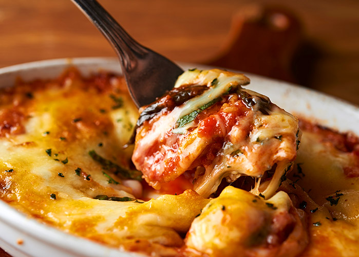 茄子やトマトにチーズをたっぷりと被せ、こんがりと焼き目が付くように焼き上げます。